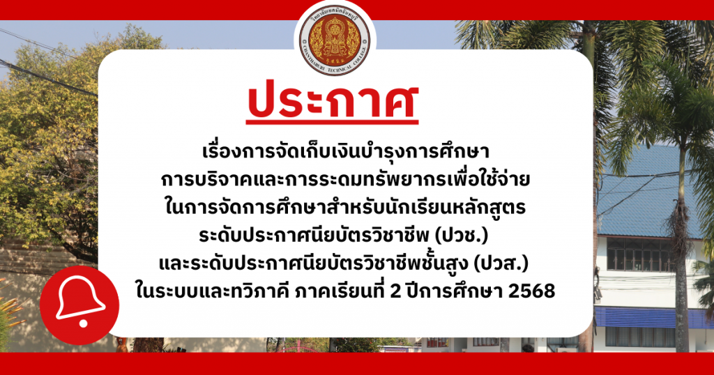 ปพัชญานันทน์ เพ็งแจ่ม 3 สัปดาห์ ago 1 min read Post Views: 549 Continue Reading Previous ค่าลงทะเบียนเรียน 2/2568Next ลงทะเบียนเรียนภาคเรียนที่ 2/2568 ข่าวเพิ่มเติม 1 min read รับสมัครลูกจ้างชั่วคราว 3 วัน ago ปพัชญานันทน์ เพ็งแจ่ม 1 min read ลงทะเบียนเรียนภาคเรียนที่ 2/2568 2 สัปดาห์ ago admin 1 min read ค่าลงทะเบียนเรียน 2/2568 3 สัปดาห์ ago ปพัชญานันทน์ เพ็งแจ่ม